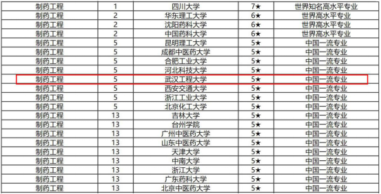 制药工程专业与昆明理工大学、成都中医药大学、合肥工业大学、河北科技大学、西安交通大学、浙江工业大学和北京化工大学制药工程专业并列全国第5名。