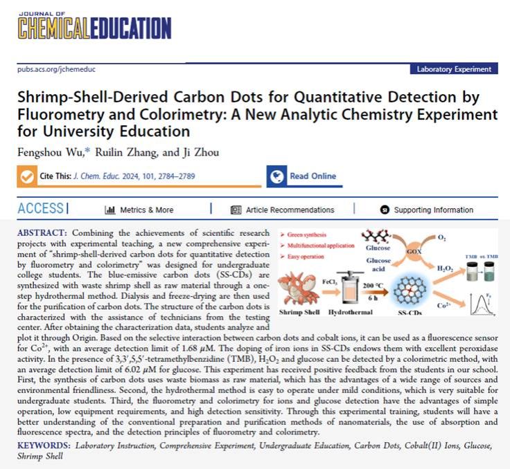 化工与制药学院吴风收教授在化学教育国际顶级期刊《Journal of Chemical Education》(JCE)发表最新教研论文“Shrimp Shell-derived Carbon Dots for Quantitative Detection by Fluorometry and Colorimetry: A New Analytic Chemistry Experiment for University Education”。吴风收教授为该论文的第一作者和通讯作者,武汉工程大学为唯一通讯单位。