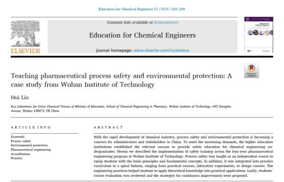 (通讯员 高慧)近日,化工与制药学院刘慧老师在《Education for Chemical Engineers》(中文名《化学工程师教育》)上发表题为“Teaching pharmaceutical process safety and environmental protection: A case study from Wuhan Institute of Technology”的教研论文。刘慧副教授为该论文的第一作者和通讯作者,武汉工程大学为唯一通讯单位。