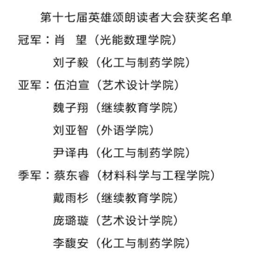 经过两轮的激烈角逐,共有10名同学脱颖而出,分别荣获一等奖、二等奖、三等奖。15名参赛选手获得优秀奖。他们或以真挚的赞美之情令人动容,或以纯熟的朗诵技巧让人折服,或以激昂的表演风格使人振奋。一位位英雄的形象通过他们的朗读变得更为立体、更加伟岸。此间山河,百代过客。月落参横,万古长青。12月12日,化药学院第十七届“英雄颂”汇报演出即将在图灵报告厅拉开帷幕,我们不见不散!