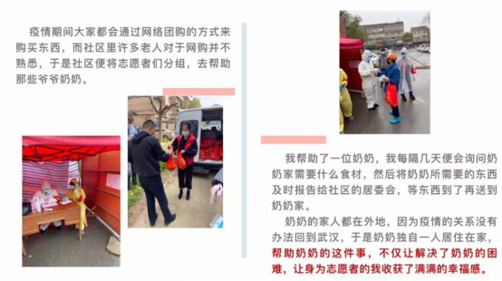 主题党日活动期间,化药学院组织开展学习党员、入党积极分子抗疫故事宣讲会,讲述抗击疫情中青年学生的真实经历和感人故事,展现在抗击疫情中,学院学子努力为人民服务、艰苦奋斗、砥砺前进的精神。2018级化卓班的李睿媛讲述了自己在社区里发放生活物资、防疫执勤的志愿服务故事,分享了自己的入党初心;2016级的毕业生潘志立则为同学们细述了自己报名武汉市志愿者,并积极参与社区防疫工作,为社区居民生活提供服务的经历感悟。志愿者们用自己的实际行动诠释了当代大学生的担当与奉献精神,为学院学子树起了一面面旗帜。