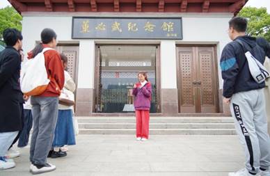 纪念馆门口,李欣妍同学向大家介绍董老的崇高品质和馆内布局,接着大家一同进入纪念馆,结合介绍与展品感受董老光辉而伟大的一生。
