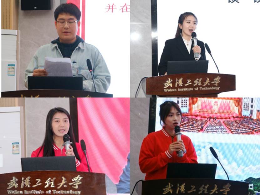 会上,化工与制药学院2021年级中外二班陈恒君,声情并茂地讲述了自己家乡数十年如一日学习、宣讲党史的“党史爷爷”王明林的故事,陈恒君同学用王明林老人平凡而伟大的事迹鼓励在座各位同学,一定牢记习近平总书记嘱托,认真学习贯彻党的二十大精神,矢志不渝跟党走。化工与制药学院2021年级中外二班任雨晨同学以《追忆许志伟英雄 传承许志伟精神》为题,为大家再现了许志伟学长的英雄事迹,并号召广大党员同学铭记先辈精神,发挥党员先锋模范作用,以实际行动不断弘扬与践行许志伟志愿精神。马克思主义学院2022级研究生刘蜜为大家带来《实现建军一百年奋斗目标 开创国防和军队现代化新局面》主题宣讲,她从解读建军一百年奋斗目标开始,深刻阐述了国防和军队现代化“新三步走”战略,重点讲解了建军一百年奋斗目标的内涵。接着从三个方面阐述了进一步提高国防和军队现代化的必要性。最后结合视频的形式展示了新时代以来十年强军的成果。马克思主义学院2022级研究生王梦凡则以《增进民生福祉,提高人民生活品质——湖北通城县村民的致富良方》为题,从“增进民生福祉的新部署”“党和国家重视民生的理论依据”“湖北通城县村民的致富良方”三个方面展开。聚焦湖北省通城县的致富之路,为同学们生动诠释了民生领域我国在世界减贫史上创造的伟大奇迹。