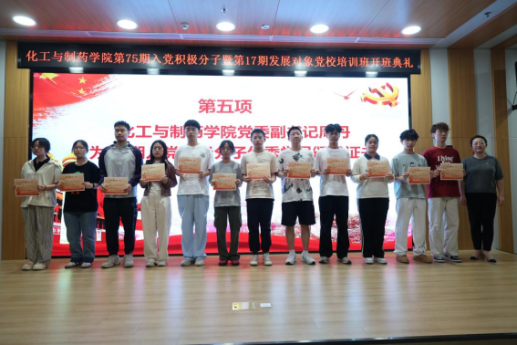 本网讯(通讯员 翟森稳)为深入学习贯彻党的二十大和二十届三中全会精神,严格把好发展党员“入口关”,进一步提升党员发展质量,4月27日,化工与制药学院分党校在综合楼102会议室举办第75期入党积极分子暨第17期发展对象培训班开班典礼。学院党委书记杨海波、党委副书记周丹、党务干事常琬笛及学院105名入党积极分子和74名发展对象出席开班典礼,开班典礼由培训班班主任翟森稳主持。