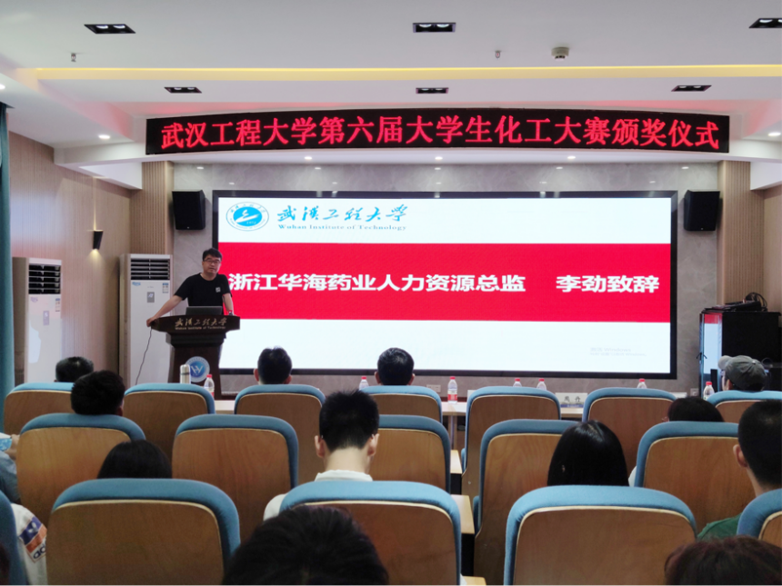 李劲在典礼中致辞,他表示在学科竞赛中勇攀高峰、攻坚克难,不断向难题发起挑战,是武汉工程大学化工与制药学院学生具有的优秀品格。武汉工程大学化学工程与技术是湖北省重点学科,学好化工专业知识,提升专业能力,不断创新是同学们未来求职道路上的重要保障。在浙江华海药业有很多学校的校友,他希望同学们要向优秀校友学习,继续发扬、传承工大精神。他热忱地邀请同学们到浙江华海药业实地参观学习。