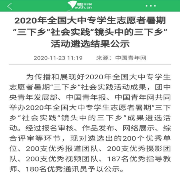 2020年团中央“镜头中的三下乡”成果遴选结果公示,正妹 “星火”实践团的参赛视频经层层筛选,最终脱颖而出,斩获“优秀视频奖”。此次获奖是继2018年、2019年后,化工与制药学院“初心”系列暑期社会实践团第三次获得此殊荣。