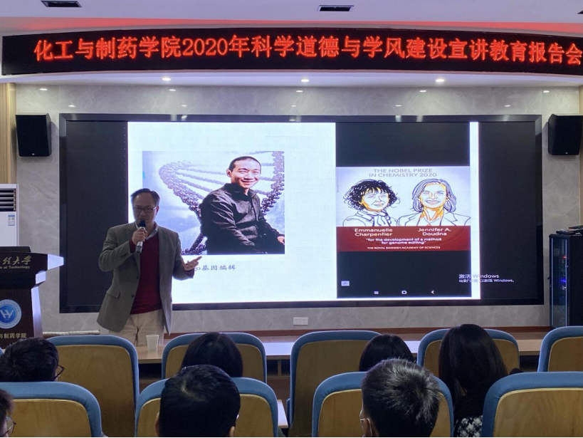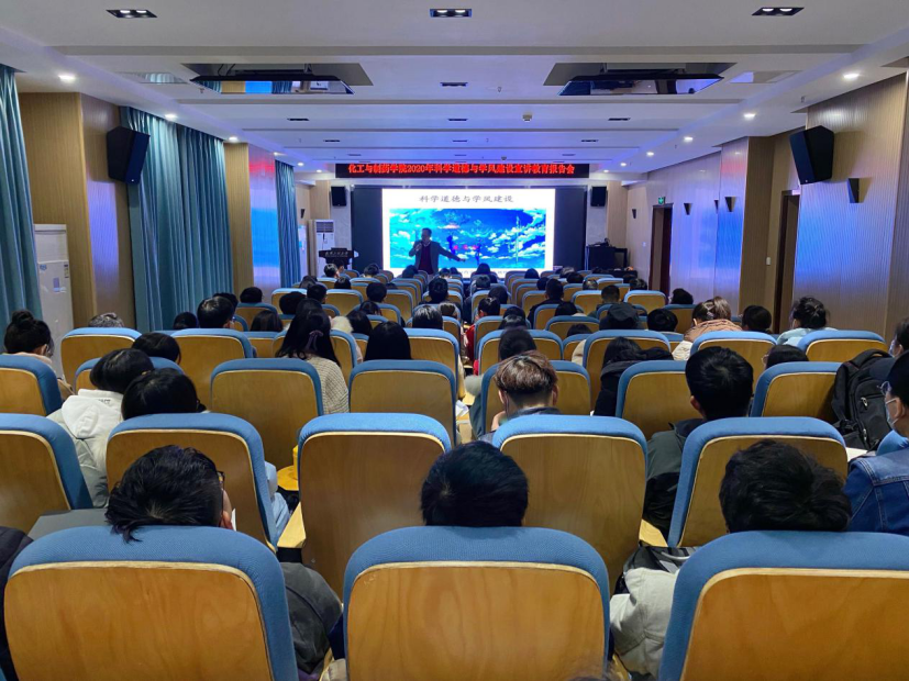 本网讯(通讯员 周雅琪)为深入学习贯彻习近平总书记关于科学道德和科研诚信建设重要指示精神,贯彻落实《关于进一步加强科研诚信建设的若干意见》《关于进一步弘扬科学家精神加强作风和学风建设的意见》,12月12日,化工与制药学院在大化工楼610报告厅举办科学道德和学风建设宣讲教育专题报告会,学院副院长龙思会作专题报告。导师代表、研究生辅导员及100余名研究生参会。