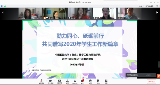 本网讯(通讯员 周雅琪)为进一步落实全国高校与湖北高校毕业生就业创业工作“一帮一”行动精神,5月4日,一场别开生面的“云端”学生工作交流会在腾讯会议平台如期举办。中国石油大学(北京)化学工程与环境学院党委副书记孙净宇携学生工作队伍与化工与制药学院全体辅导员齐聚线上会议室,通过汇报交流在学生工作方面所积累的经验与感悟,积极推动学生工作创新。交流会由学院党委副书记周丹主持。