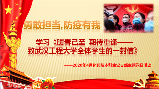 本网讯(通讯员 沈霁月)近日,学校推出了《暖春已至 期待重逢——致武汉工程大学全体学生的一封信》,号召广大学生担责任、抗疫情、重学业。在收到一封信后,根据院党委的部署,化工与制药学院各本科生党支部纷纷行动起来,围绕学校致全体学生的一封信内容,开展了“勇敢担当 防疫有我”主题党日活动,学习防疫指南、致敬抗疫英雄、加强线上学习,增强党员的责任意识。