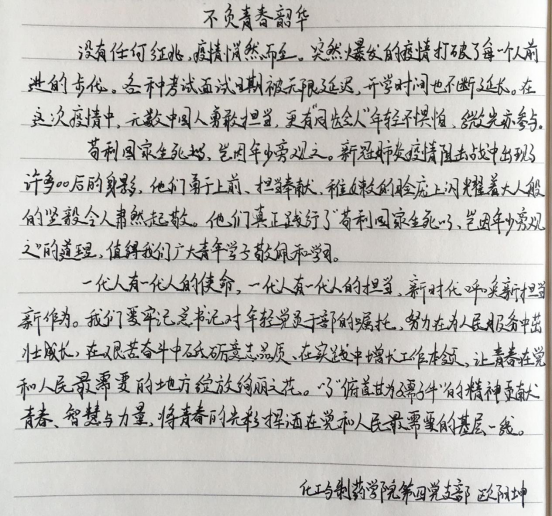 勇敢担当,防疫有我!面对疫情,只有众志成城,方能共度时艰。化药学院学生党支部全体党员将充分发挥先锋模范作用,坚持学习不掉线、抗疫不掉队,积极践行初心和使命,让青春在党和人民最需要的地方绽放绚丽之花。