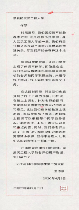 在学校推出一封信后,学生三支部立即组织支部党员通过网络,深入学习相关内容,领会有关精神。支部党员读信后深受鼓舞,展开热烈讨论,并在云端发起给学校写一封回信的活动,党员们踊跃参与,在群里晒回信、晒感想,表达自己对于学校、学院、同学的想念之情,并表示将继续做好防疫工作,在未接到返校通知时,坚持居家隔离、健康打卡、线上学习,积极配合学校的防控决策部署,争做防疫先锋,树好党员这面伟大旗帜。
