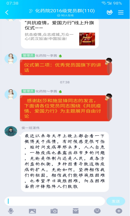 2016级在年级党员交流群开展升旗仪式,优秀党员代表学生第四党支部施显峰,学生第六党支部赵莎在观摩结束后作主题发言。全体学生党员纷纷在群里分享个人的心得体会感受。