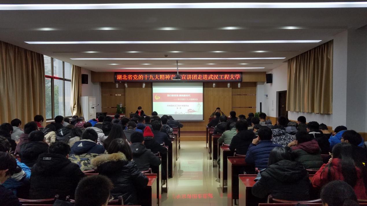 12月15日上午,湖北省党的十九大精神青年宣讲团走进武汉工程大学,在流芳校区机电工程学院205学术报告厅,省青年宣讲团成员、校团委书记李芳作为主讲人,为我院和机电工程学院青年学生代表宣讲十九大精神。报告会由学院团委副书记谭明武主持,机电学院团委书记杨文灏、副书记朱冬冬与100余名青年学生代表共同参加了活动。