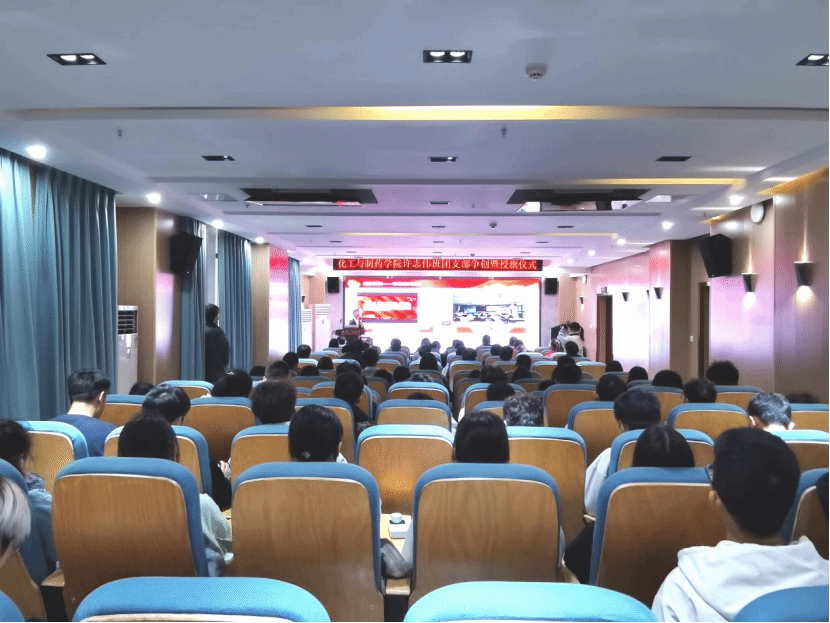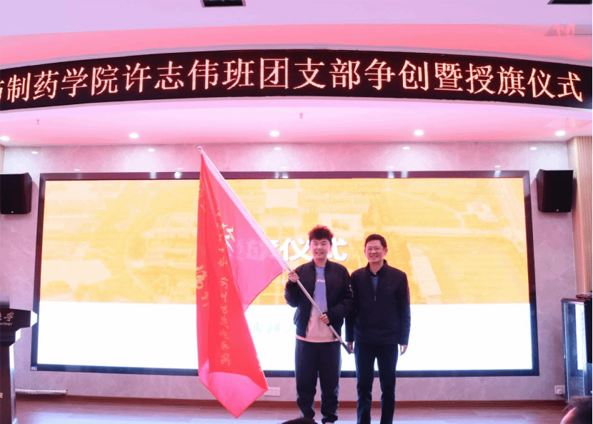 党委学工部部长吕容涛、校团委副书记邓欢、化工与制药学院党委书记汪铁林为第二期许志伟班团支部授旗。