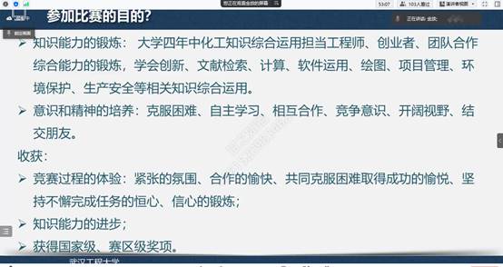 会上,金放解读了化工设计竞赛的基本流程,介绍了竞赛组队、团队分工、竞赛形式、评分规则等内容,阐述了竞赛所需的专业课知识、专业软件使用、信息检索技能与项目撰写方法,鼓励学生多组队伍参加竞赛,并对参赛队员提出了要求与期望,希望参赛学生能坚持不懈、注重效率、勇于创新,争取在竞赛中取得优异的成绩。