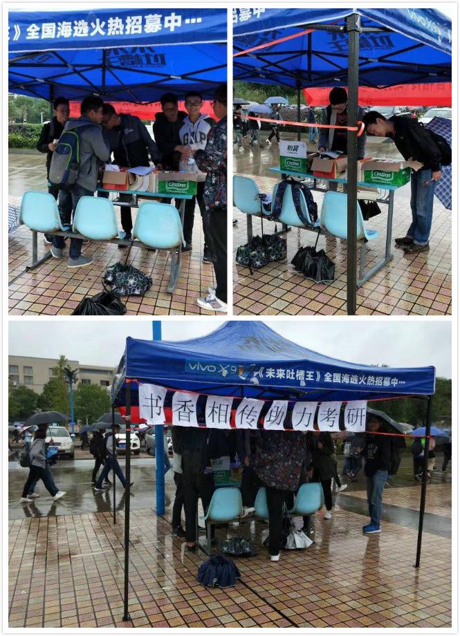 2017年10月16日至10月17日许志伟志愿服务队在武汉工程大学流芳校区大礼堂前和教辅中快食堂门口开展了为期两天的免费赠书活动,免费发放考研书籍100余本。