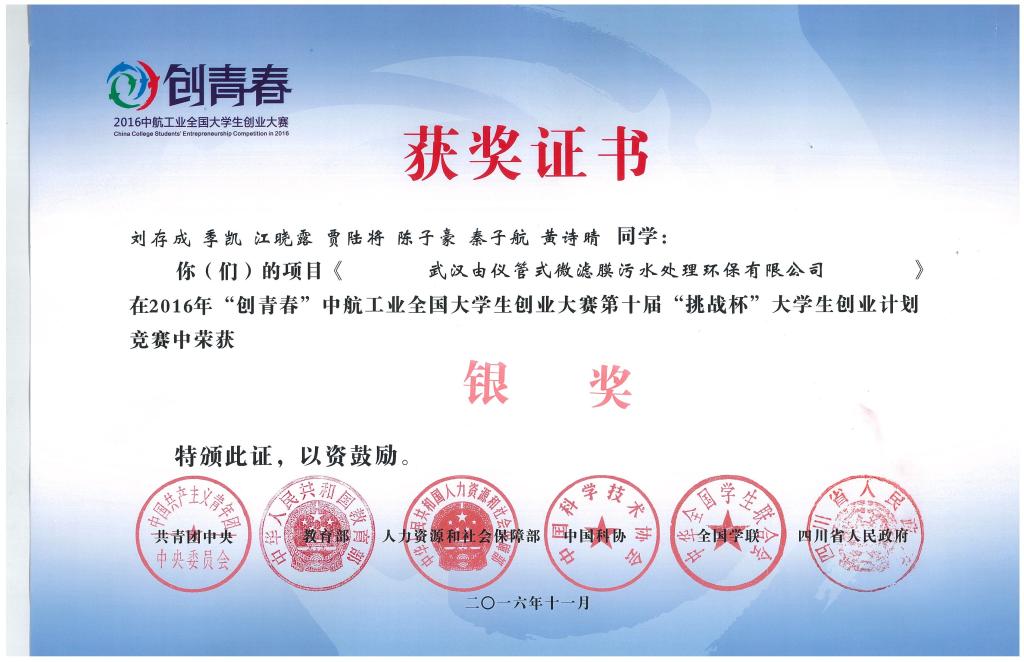 11月15日-20日,由共青团中央、教育部、人力资源和社会保障部、中国科协、全国学联、四川省人民政府联合主办的2016年“创青春”全国大学生创业大赛终审决赛在电子科技大学清水河校区落下帷幕正妹 化工与制药学院研究生刘存成负责的计划创业项目《武汉由仪管式微滤膜污水处理环保有限公司》经过激烈的角逐,成功获全国银奖
