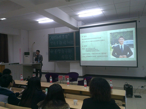 11月23日晚,化工与制药学院2014“化药菁英”学生干部培训班第三讲在流芳校区L3119教室举行。湖北省学生联合会驻会执行主席、武汉大学第33届学生会主席胡可夫和武汉工程大学学生会执行主席王自鑫应邀同学院200余名学生干部进行了交流。
