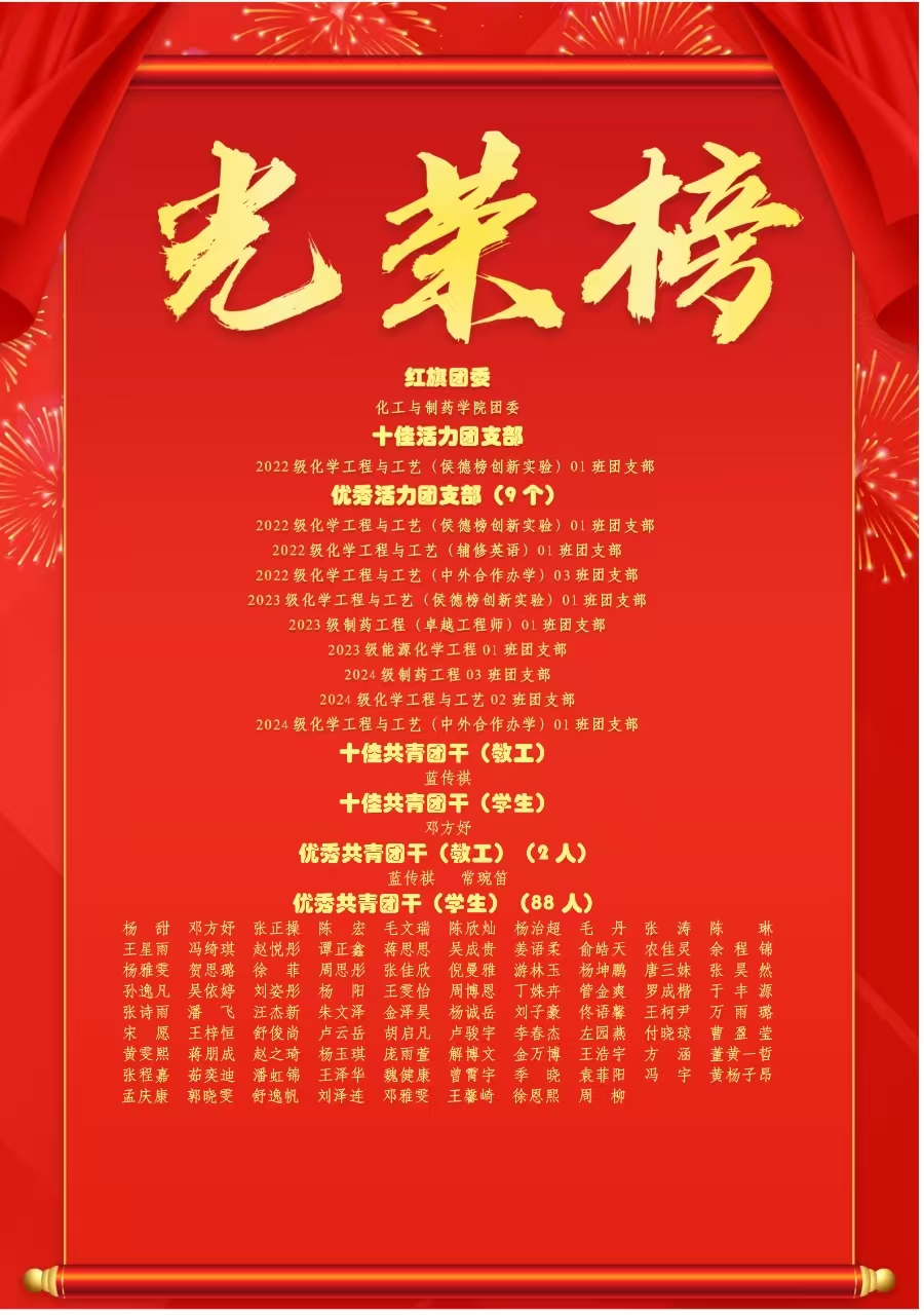 青年怀壮志,奋进正当时。化工与制药学院将继续带领青年追随信仰之光、扛起历史之责、不负时代之望,发扬工大精神,团结带领广大青年踔厉奋发、勇毅前行,在全面建设社会主义现代化国家的新征程上唱响更为嘹亮激越的青春之歌,在全面推进中华民族伟大复兴的历史进程中书写更为绚丽夺目的青春篇章!(审稿 周丹)