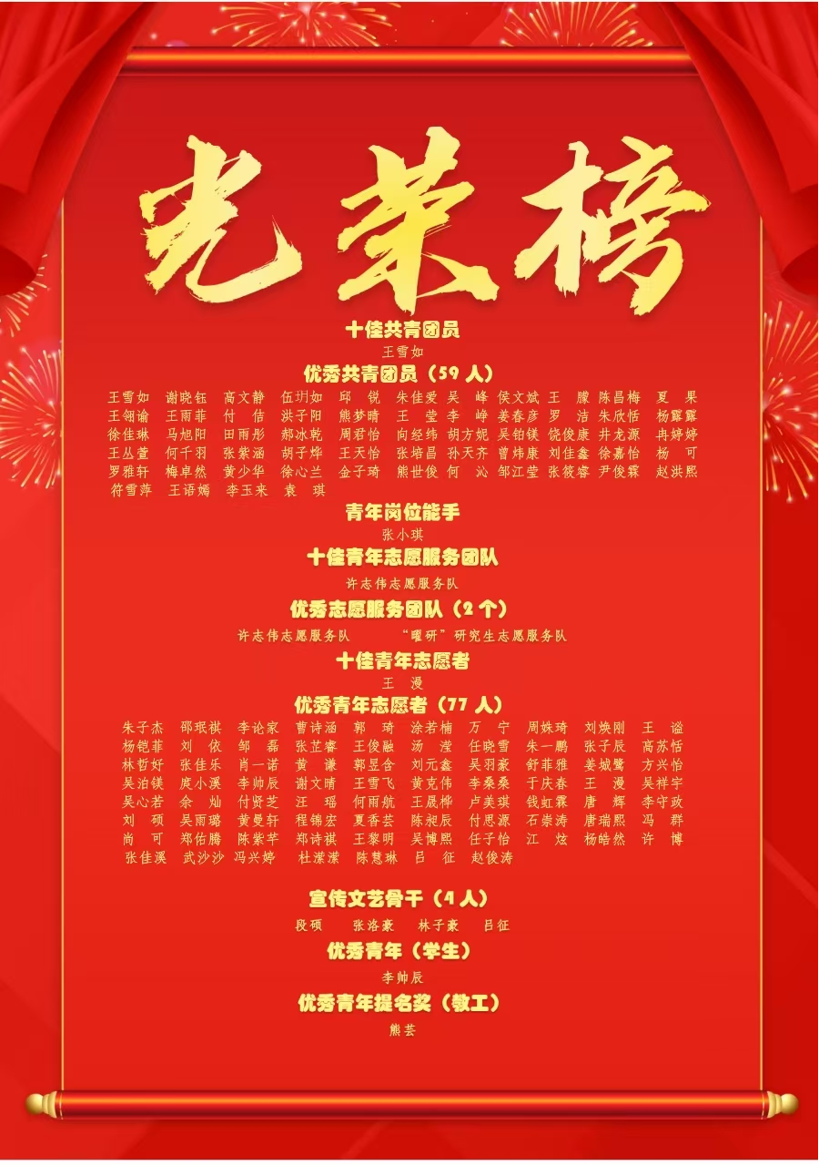 本网讯(通讯员 蓝传祺)化育菁英传薪火,勤学实干谱华章。为纪念五四运动106周年,以青春之名,点燃榜样之光,4月29日,武汉工程大学2025年五四表彰大会在流芳校区大礼堂举行。化工与制药学院团委获评武汉工程大学“五四红旗团委”。许志伟志愿服务队荣获“十佳青年志愿者服务团队”,2022级化学工程与工艺(侯德榜创新实验)01班团支部荣获“十佳活力团支部”,熊芸教授荣获“优秀青年提名奖(教工)”,蓝传祺荣获“十佳共青团干(教工)”,邓方妤荣获“十佳共青团干(学生)”,李帅辰荣获“优秀青年(学生)”,王雪如荣获“十佳共青团员”,王漫荣获“十佳青年志愿者”。