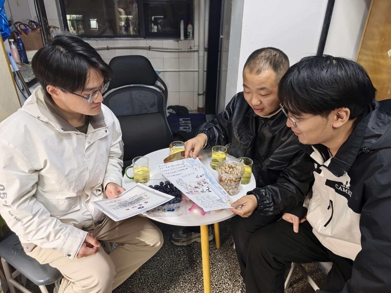 活动中,张列罡、付佶和刘佳鑫一同查看了寝室的宿舍公约,细致询问公约落实情况,结合实际提出优化意见,叮嘱同学们共同遵守纪律与公约,携手营造整洁有序、互助友爱的寝室氛围。