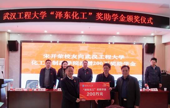 宋开荣向武汉工程大学化工与制药学院捐赠200万元设立“泽东化工”奖助学金,其中,本科奖学金每生8000元、研究生奖学金每生10000元、本科助学金每生5000元、研究生助学金每生10000元和就业奖金每生10000元。