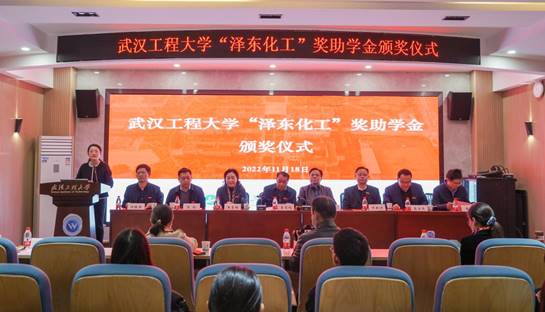本网讯(通讯员 汤曦)11月18日下午,武汉工程大学“泽东化工”奖助学金颁奖仪式在流芳校区化工大楼610报告厅举行。校党委副书记李志旭,80级校友、襄阳泽东化工集团股份有限公司党委书记、集团董事局主席宋开荣,襄阳泽东化工集团股份有限公司供应部副部长李玲、襄阳泽东新能源发展有限公司生产技术部部长尹芙蓉、办公室副主任龚群涛,校四级职员王雪梅,党委学工部部长吕容涛,党委研工部部长、研究生院院长熊伦,校友工作处处长邓新洲,化工与制药学院党委书记汪铁林、院长易群出席会议,会议由化工与制药学院党委副书记周丹主持。