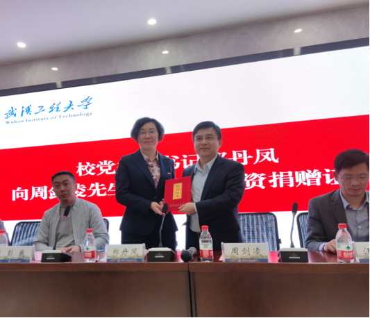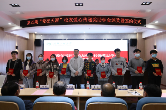 本网讯(通讯员 李茜)11月7日,武汉工程大学第23期“爱在天涯”校友爱心传递奖助学金颁奖暨签约仪式在流芳校区化工大楼610报告厅举行。校党委副书记郑丹凤,设奖校友代表周剑凌、彭巍、晏文茂、赵晓娟、刘继君、王富铭、李明、马尚、杨柳等,党委学生工作部、校友工作处、化工与制药学院、外语学院相关领导参加仪式,会议由党委学生工作部副部长徐迪迪主持。