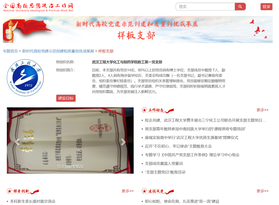 教工一支部始终坚持立德树人根本任务,对学生从文明修身、成长成才方面全员全程全方位培养教育,树牢本科教学中心地位,努力形成工程大学的工程教育特色与亮点。化学工程与技术是湖北省省属高校理工类学科唯一的一个B+档,也是湖北省双一流建设学科。2019年化学工程与工艺专业核心课程“化学反应工程”获批国家首批国家一流本科线下课程;“化工专业建设与改革教学团队”获批2019年全国石油和化工教育优秀教学团队;沈喜洲、丁一刚教授主持科研项目荣获湖北省科技进步一等奖;支部党员教师连续三年发表高被引论文100余篇,超过40项发明专利获得授权;“化工专业‘新工科’建设教学团队”获批2019年湖北高校省级教学团队;“化学工程与工艺人才培养与发展中心”获批2019年湖北高校省级优秀基层教学组织。湖北申昙环保新材料有限公司投资1000万与学院组建“催化材料与催化剂工程联合实验室”;武汉研润科技发展有限公司投资600万与正妹