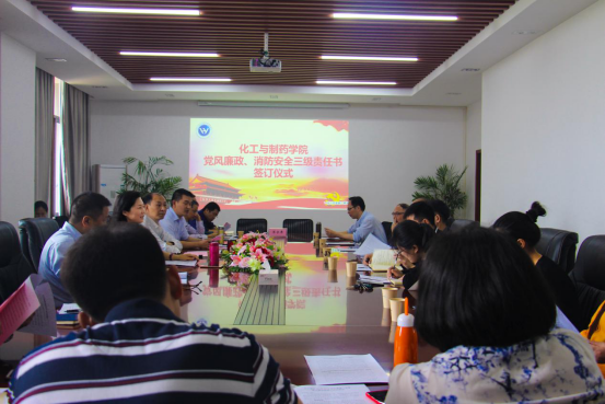 本网讯(通讯员 周丹)4月25日上午,化工与制药学院举行党风廉政、消防安全三级责任书签订仪式。学院领导班子,各发展中心主任、副主任,党支部书记、副书记,学院教代会代表及特邀代表参加了签订仪式。学院党委副书记田勇主持仪式。