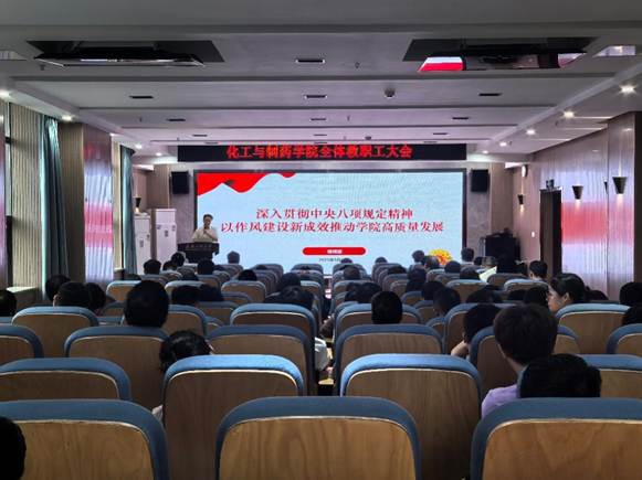 本网讯(通讯员 常琬笛 冯婧)5月8日下午,化工与制药学院党委书记杨海波以《深入贯彻中央八项规定精神,以作风建设新成效推动学院高质量发展》为题,在化工大楼610报告厅讲授深入贯彻中央八项规定精神学习教育专题党课,学院全体党员,党外人士代表参与会议。