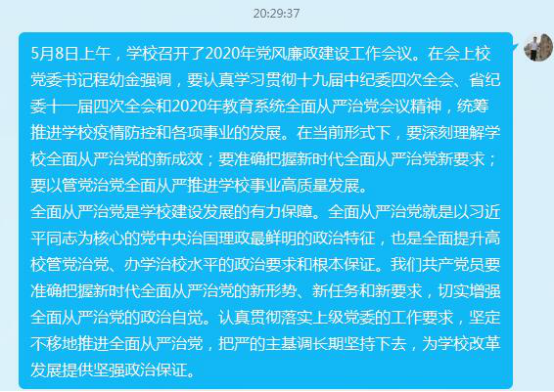 学习环节,各支部在完成规定动作后,采取支部书记讲授微党课、党员主题发言、集体观看学习视频、围绕主题学习讨论等多种形式开展线上主题党日活动,重点学习了习近平总书记在5月6日召开的中共中央政治局常务委员会会议上的讲话精神、习近平总书记在4月29日召开的中共中央政治局常务委员会会议上的讲话精神和学校2020年党风廉政建设工作会议精神。