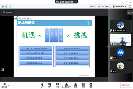 黄胜结合自身工作经历,向学生介绍了国家关于智能制造产业升级的政策方针,讲解了化工与制药产品产业链概念,深入剖析化工与制药行业智能制造的目标导向、前沿技术、发展阶段、机遇挑战和应用前景,讲述了制药装备研究和智能产业化方面的优势和特色,并从国际制造业发展趋势、制药装备技术、传统药品制造过程、制药装备产业技术等方面综合分析了制药行业的发展前景。他通过视频图像演示模拟,并结合上海森松在制药行业智能制造的开拓案例和实践经验进行分享,生动形象地阐释了上海森松制药企业高效利用数字化技术路径和智能装备工艺来推动引领制药行业的发展。