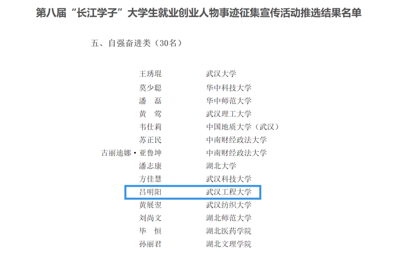 本网讯(通讯员 沈霁月)近日,湖北省教育厅第八届“长江学子”大学生就业创业人物事迹征集活动结果公布,全省共有150名大学生入选,正妹