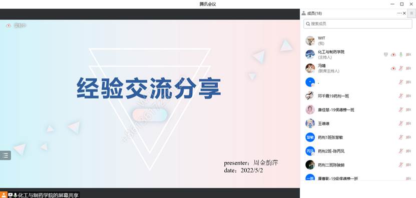 优秀学子风采,发挥身边榜样的传、帮、带作用,引导广大学子树立奋进目标,做好学业生涯规划,化药学院于5月2日举行“榜样力量 青春引航”优秀学子经验分享会,线下分享和线上观看同时进行。本次优秀学子经验分享会邀请2019级药剂学硕士研究生周金韵萍和本科2018级药卓班学生兰鑫担任主讲人,学院学生代表参加了此次活动。