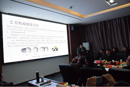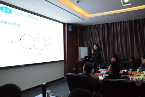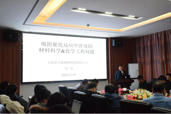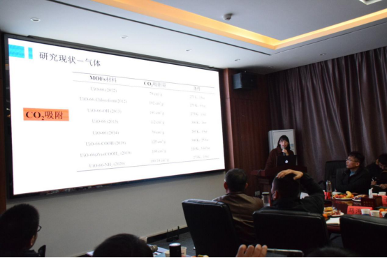 下午的学术报告由联合实验室的5位研究生介绍各自课题的研究进展。博士研究生孔剑作了“有机硫研究进展”的报告,硕士研究生毛惠东作了“NO催化氧化研究进展”的报告,硕士研究生罗海彬作了“NO催化还原研究进展”的报告,硕士研究生罗时万作了“芳香烃吸附研究进展”的报告,硕士研究生王洪婷作了“基于MOFs材料的气体吸附分离研究进展”的报告。申昙集团高层对联合实验室的课题进展给予了充分肯定,并从材料设计、研究方法和应用场景等方面对承担课题的研究生给予了具体的建议和指导。