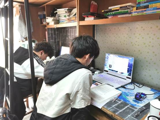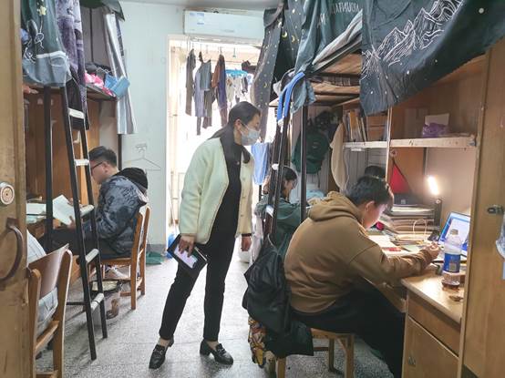在疫情防控政策下,部分课程从线下转换成线上授课。为了解学生上网课的效果,及时解决学生遇到的问题,学院领导、辅导员和团委骨干组成督察小组,定期分批走访学生宿舍,查看学生上网课情况,深入了解疫情防控期间学生的学习生活与身心健康。走访过程中,同学们能够克服实际困难,聚精会神地坐在电脑前进行网课学习,跟着老师的节奏认真记录笔记。