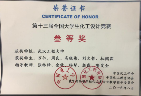 Green-Chem-2025团队由来自化工与制药学院2016级侯德榜创新实验02班五名同学组成,荣获2019年第十三届“东华科技-恒逸石化杯”全国大学生化工设计竞赛国家三等奖、华中赛区二等奖,团队成员万仁、周良、高晓彬、刘文哲、杜懿霖,全部保研、考研成功,被华东理工大学,华南理工大学,厦门大学,武汉大学,中山大学等国内985、211高校录取。