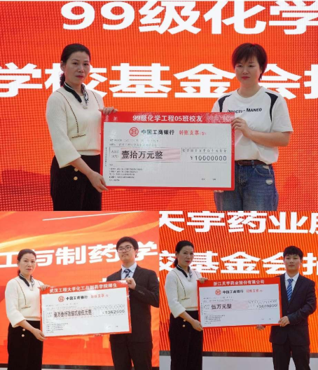 化工与制药学院师生代表陈泽旭、99级化学工程5班王金岚校友、浙江天宇药业股份有限公司代表分别向学校教育发展基金会捐赠款项支票。通过前期化工与制药学院许志伟班团支部、许志伟志愿服务队、许志伟党员先锋队开展爱心义卖筹集善款,化工与制药学院教师、校友和企业爱心捐赠,本次基金启动共筹集善款 16万余元。