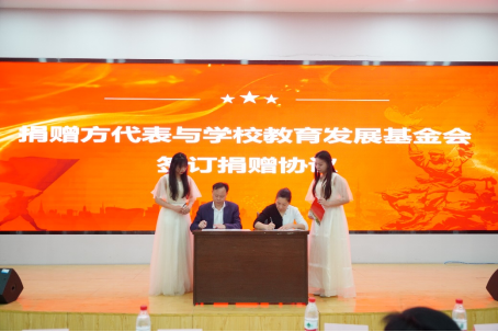 学校教育发展基金会副理事长、秘书长邓新洲与捐赠方代表张卫平校友签订捐赠协议。