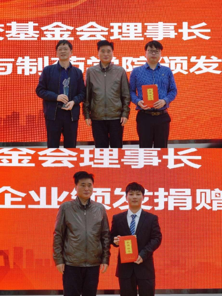 叶芃为化工与制药学院党委书记汪铁林、校友代表王治国及爱心企业颁发捐赠证书。