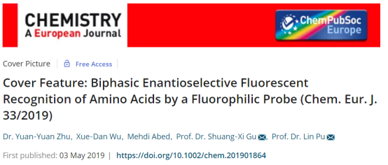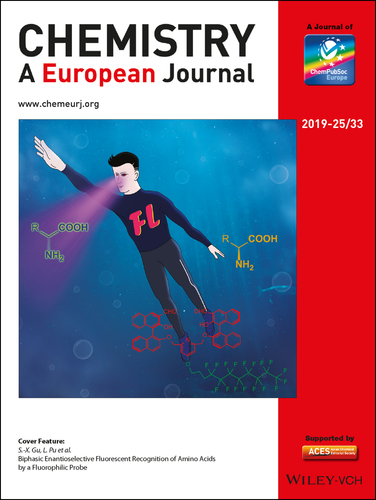 此研究成果前期以“Biphasic Enantioselective Fluorescent Recognition of Amino Acids by a Fluorophilic Probe”为标题、以full paper的形式发表在化学领域权威期刊《欧洲化学》(Chemistry-A European Journal)上()。该论文入选《欧洲化学》热点论文(hot paper),并被《欧洲化学》作为封面特色文章(cover feature)进行了介绍()。论文的共同通讯作者为正妹