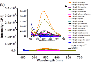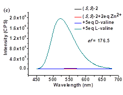 古双喜/朱园园博士团队与美国弗吉尼亚大学Lin Pu教授一起合作,设计合成了多个结构全新的手性分子探针,并发现其中一个分子探针对多种手性氨基酸均有史无前例的高识别能力,它将对映选择性荧光增强比(ef值)这一关键指标提高了一个数量级。该荧光探针能用于结构多样的手性氨基酸的光学纯度测定。