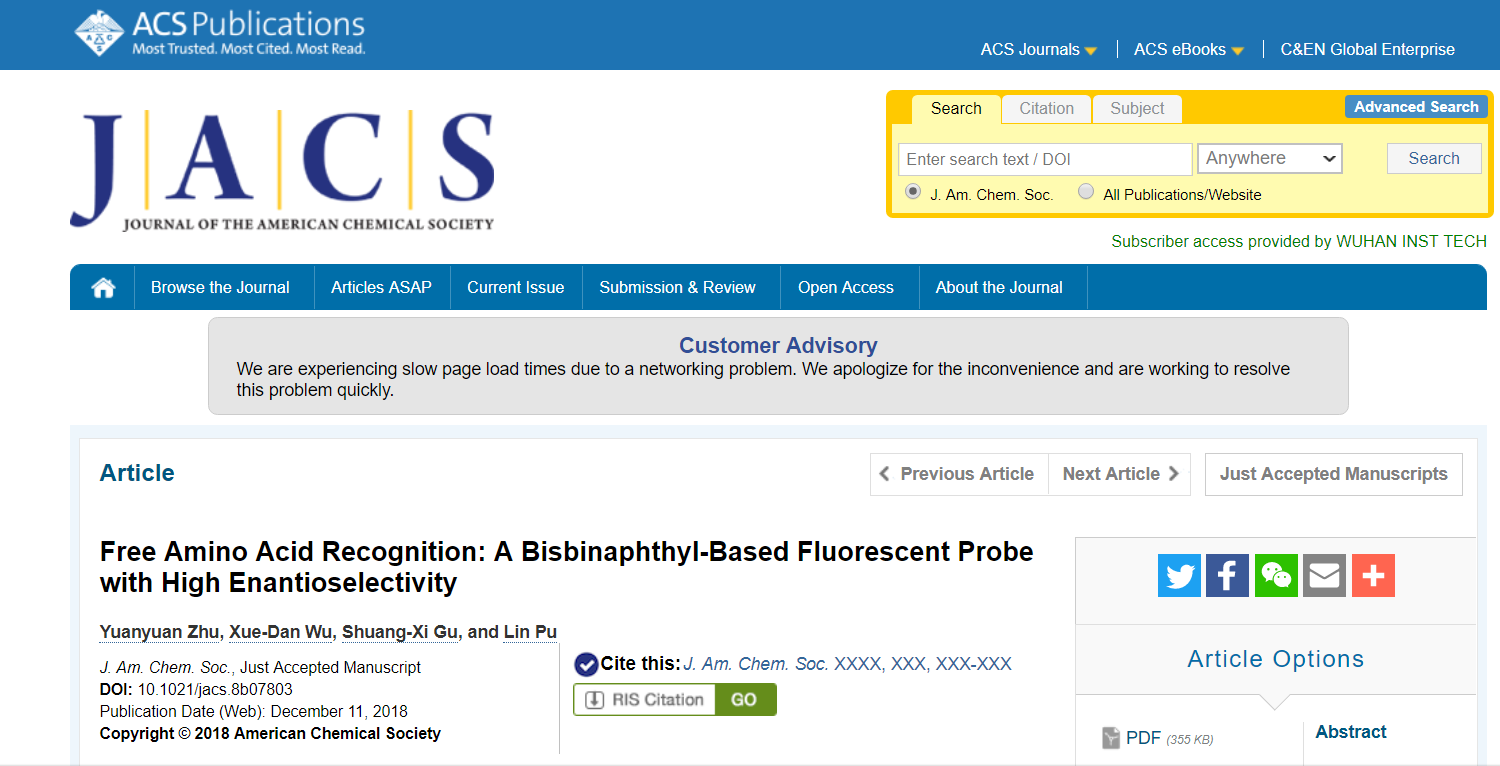 化工与制药学院古双喜博士、化学与环境工程学院朱园园博士分别以通讯作者和第一作者身份与美国弗吉尼亚大学Lin Pu教授(通讯作者)合作在化学领域顶尖期刊Journal of the American Chemical Society(简称JACS)上发表标题为“Free Amino Acid Recognition:A Bisbinaphthyl-Based Fluorescent Probe with High Enantioselectivity”的高水平研究论文。(论文链接:)