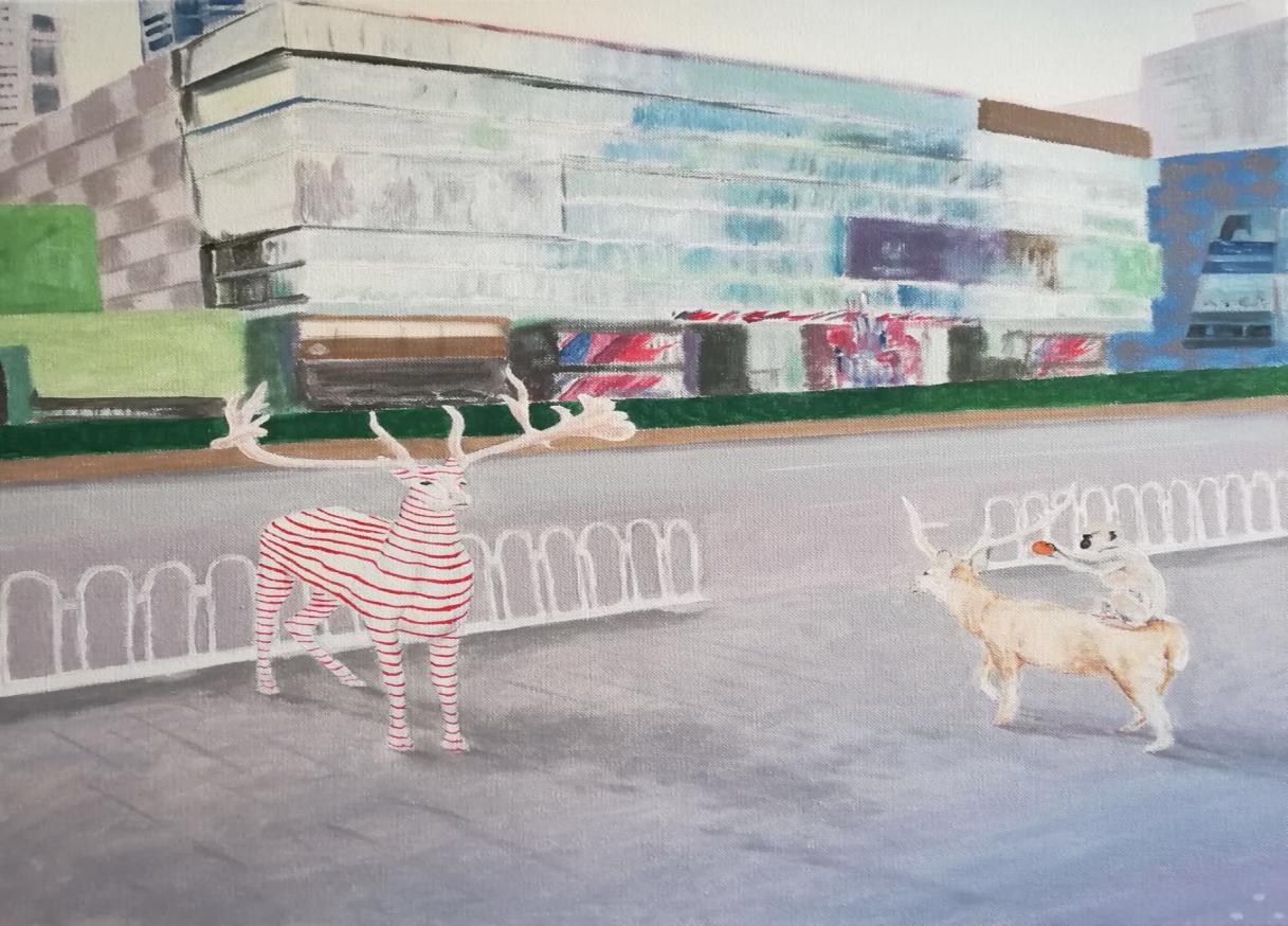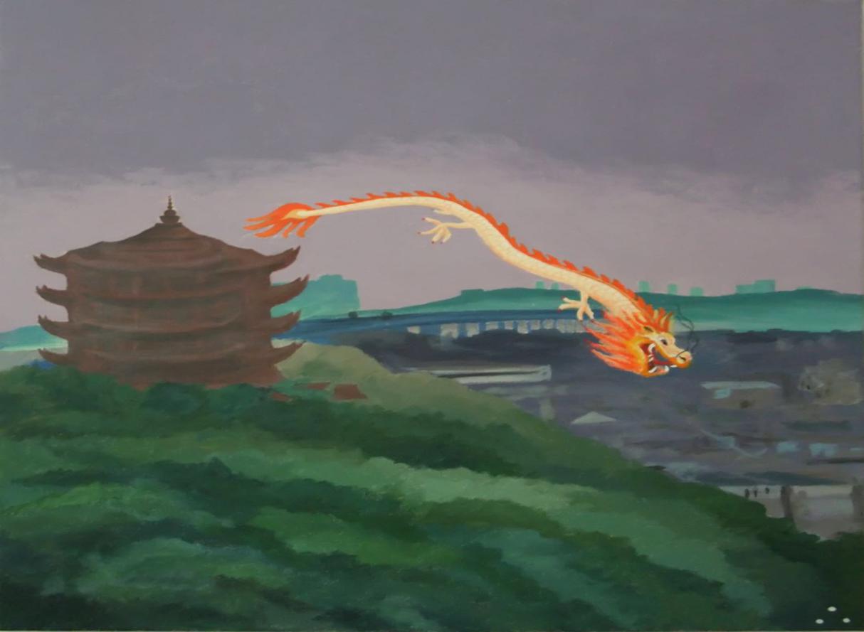 日前,长江日报记者来到约恩位于武汉工程大学的家。简朴的家中,墙上、窗户边、沙发旁,到处挂放着Yoann在武汉的创作。闲暇时,他喜欢去武汉植物园,不少作品和自然有关。作品《召唤》中,繁华的街道口,迎面而过的鹿和猴子,表达了这位法国青年重返自然的愿望,“想召唤大家亲近自然,不要将社会与自然、动物分开”。作品《龙》中乌云笼罩,暴雨将至,他想象看到一条龙在黄鹤楼上空跃过。这幅画作并不是真实的黄鹤楼的景象,而是画他想象中的世界。