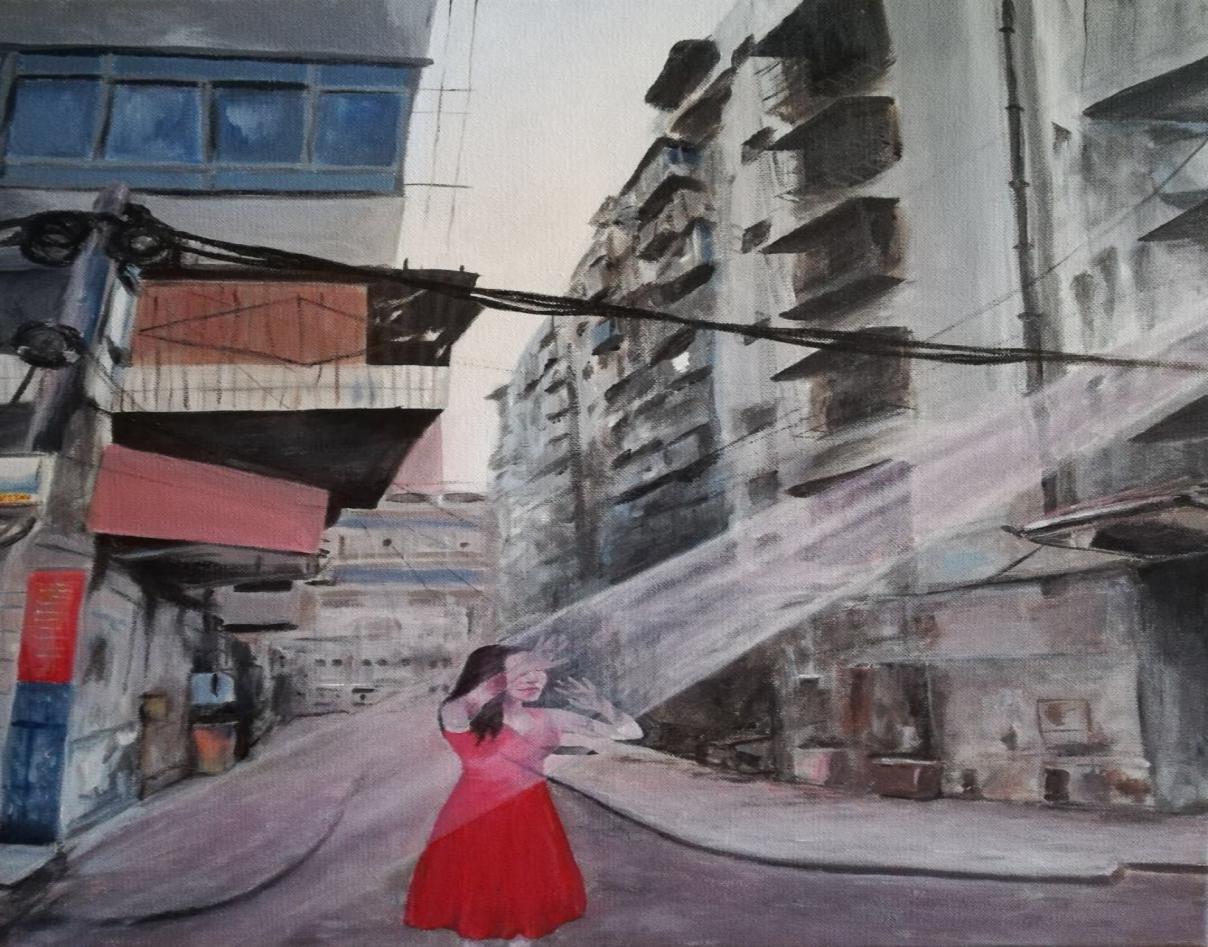 街道和建筑画好后,约恩很想在画面里加一个穿着旗袍的女人,怀念一个逝去的时代。但是他寻找了一年模特未果,当他不再抱任何期待时,有一天,却在自家楼下发现了一个穿着蓝白旗袍的女子正在拍照。Yoann上前一问,才发现这是一位学生,并且愿意成为他的模特。他说:“这种奇妙的巧合每天都在武汉发生,我很感谢”。