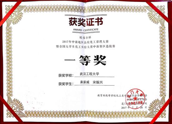 化工与制药学院2014级化学工程与工艺专业本科生来家威和宋振兴同学,凭借扎实的化工专业基础和稳定的发挥,在强手如林的竞赛中脱颖而出,获中南赛区一等奖,并将代表中南赛区参加8月份在天津大学举行的全国总决赛。