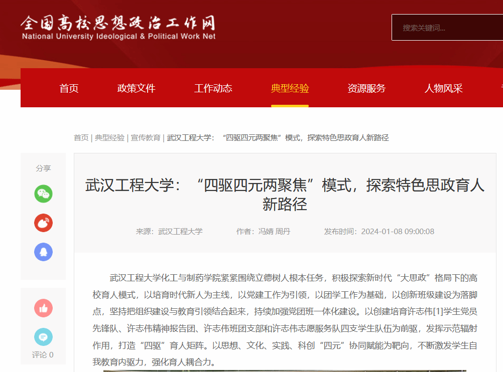 武汉工程大学化工与制药学院紧紧围绕立德树人根本任务,积极探索新时代“大思政”格局下的高校育人模式,以培育时代新人为主线,以党建工作为引领,以团学工作为基础,以创新班级建设为落脚点,坚持把组织建设与教育引领结合起来,持续加强党团班一体化建设。以创建培育许志伟[1]学生党员先锋队、许志伟精神报告团、许志伟班团支部和许志伟志愿服务队四支学生队伍为前驱,发挥示范辐射作用,打造“四驱”育人矩阵。以思想、文化、实践、科创“四元”协同赋能为靶向,不断激发学生自我教育内驱力,强化育人耦合力。
