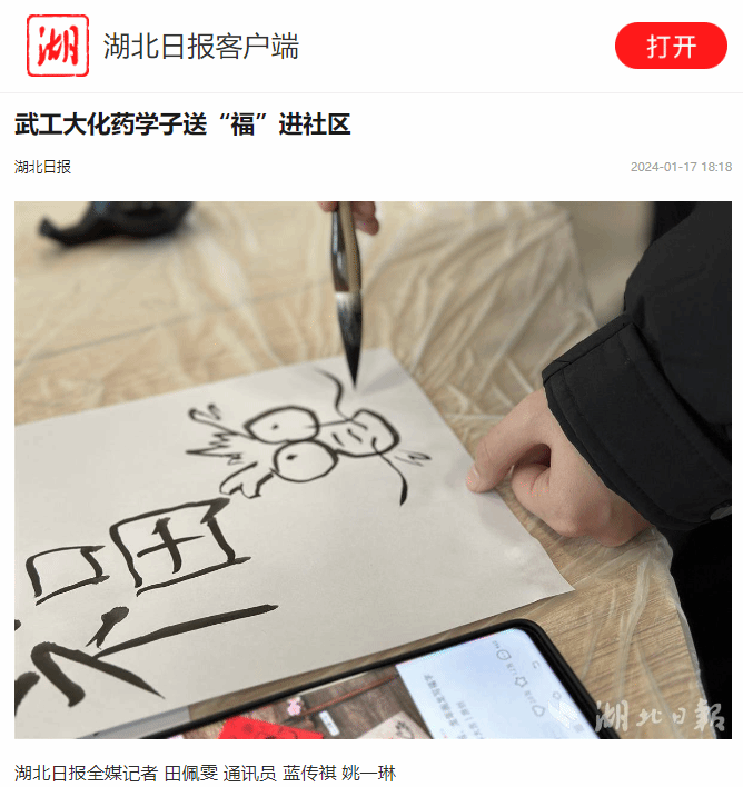 为继承和弘扬中华优秀传统文化,营造欢乐祥和的新春氛围,近日,武汉工程大学化工与制药学院在学校“一站式”学生社区、森林小镇社区开展“笔酣墨饱庆佳节‘宿’写春联送万福”活动。