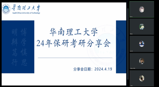 4月19日,学院组织华南理工大学线上专场考研保研经验分享会,邀请陈志远、樊羽林、谢子阳、曹思贝、管榆昕、李杨、徐佳莹7名优秀学生代表进行交流分享,他们从院校选择、资料准备、科目复习、信息获取渠道等方面分享考研经验,并结合自身给予了宝贵的建议。